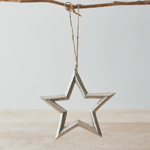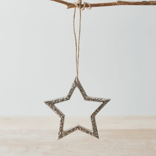 DalesIn stockA rough luxe inspired hanging star decoration, in a silver distressed finish. Comes complete with a jute hanger, perfect for hanging around the hom...